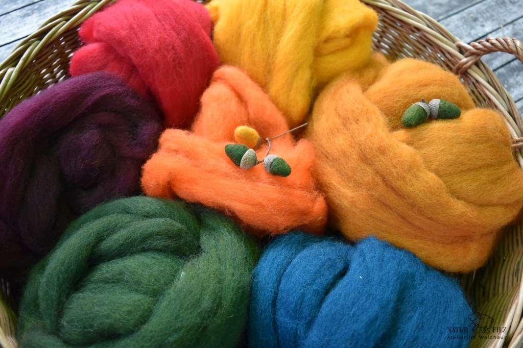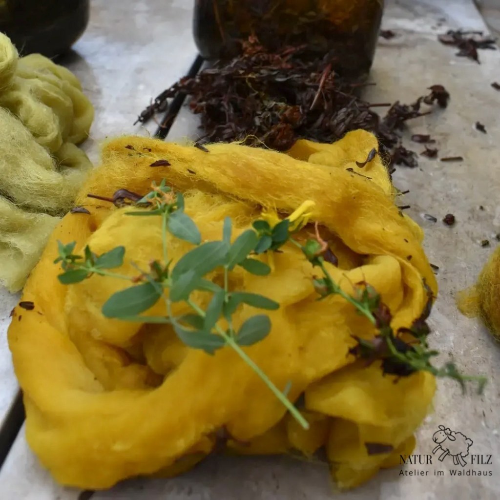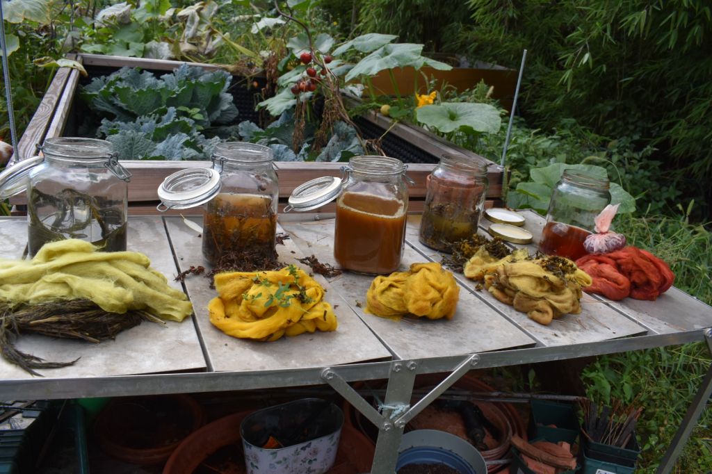 Das Färben der Wolle bietet endlose Möglichkeiten. Angefangen mit Naturfarben aus Pflanzen und Wurzeln, die ich teilweise bei meinen täglichen Spaziergängen sammeln kann habe ich die Farbpalette später mit Säurefarben erweitert. Das Färben ist jedes Mal ein Erlebnis.